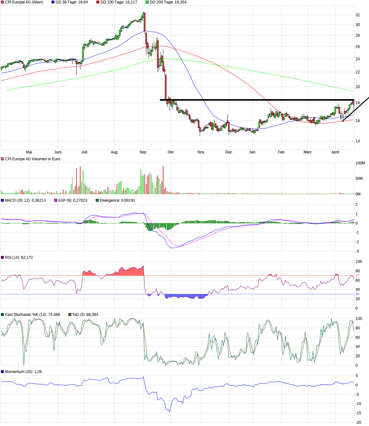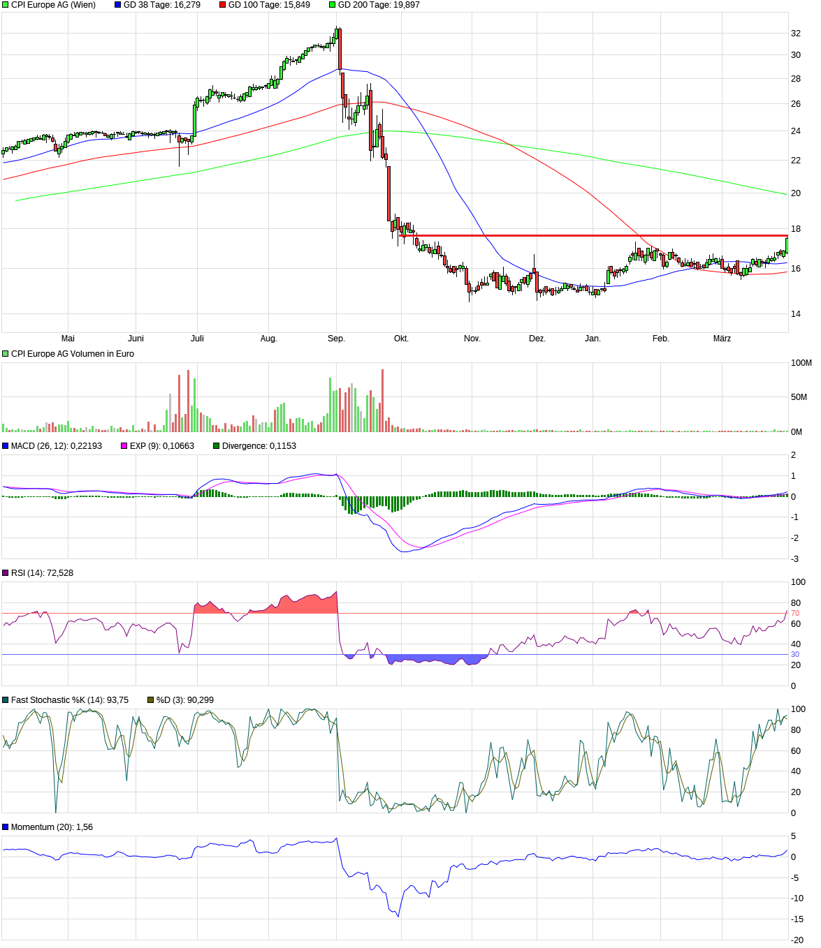 Charttechnisch die nächste Hürde ist die 100-Tagelinie, die bei 17 Euro verläuft. Die 200-Tagelinie verläuft bei ca. 21,50 Euro. Derzeit bildet sich eine "Untertasse" aus.