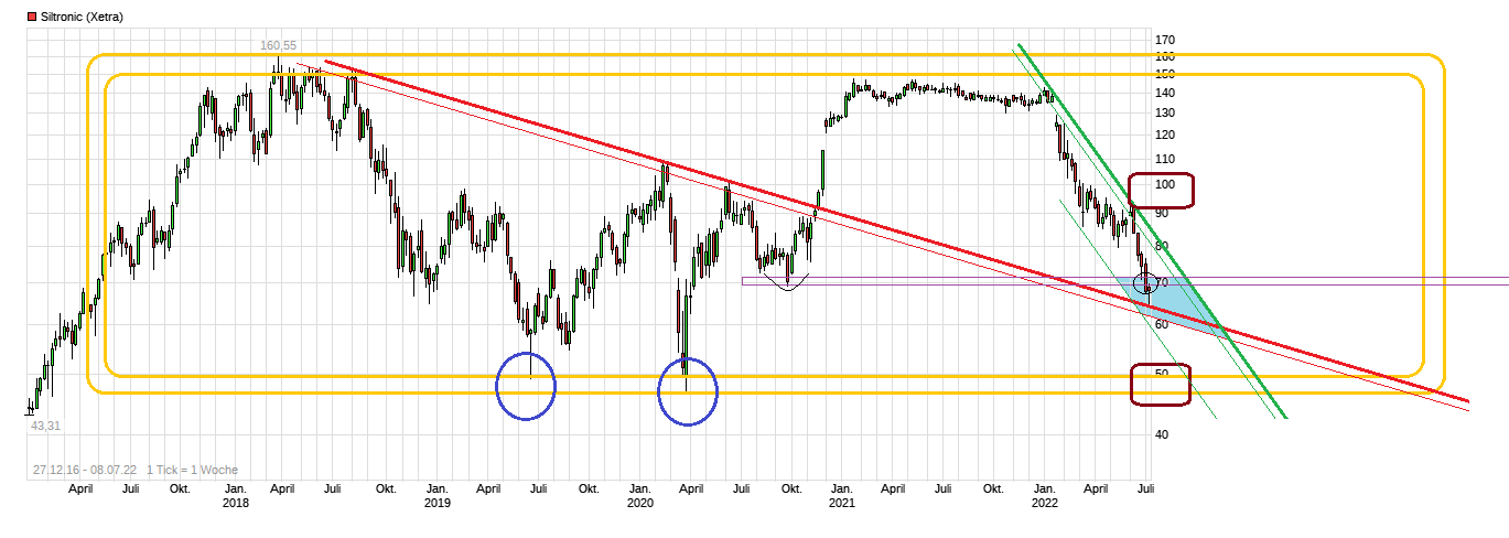 Die aktuelle Bewertung ist m.E. ein Witz. Nehmen wir mal eine Umsatzsteigerung von 25% an, dann läuft Siltronic auf ein EPS 2022 von ~11. D.h. gerade mal ein KGV von 7,2.