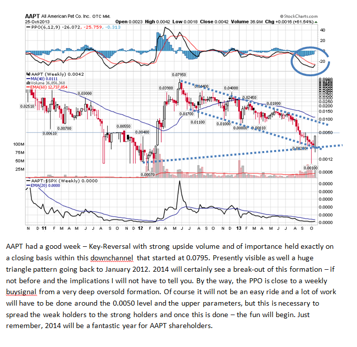All American Pet Company, Inc. (OTCBB: AAPT) -- AAPT is working diligently with its strong new finance team, including its new VP of finance, to become current and compliant with its SEC and legal filings. Outstanding filings will be completed in the very near future. Our day to day operations people are pressing to catch up on all manufacturing, sales and marketing, fronts to secure a national retail presence.