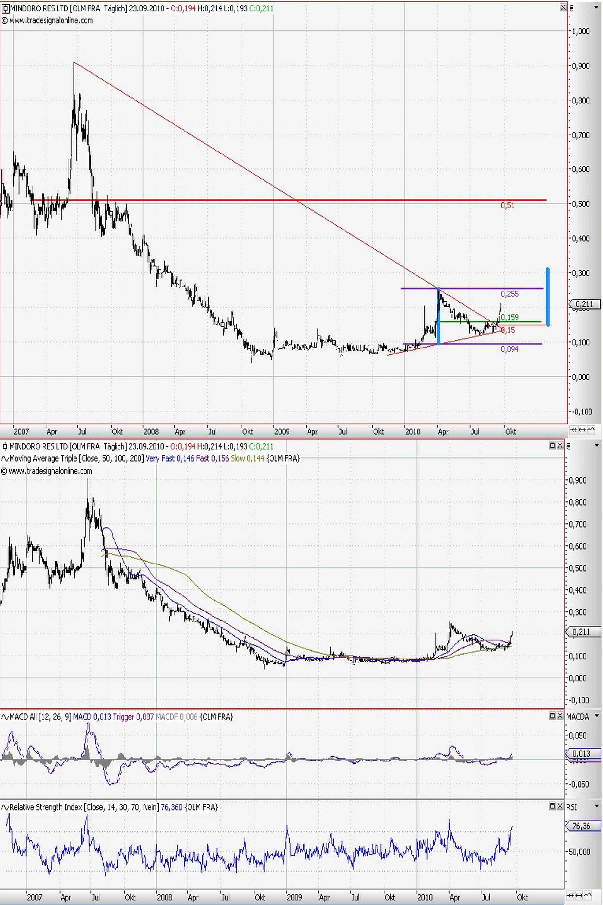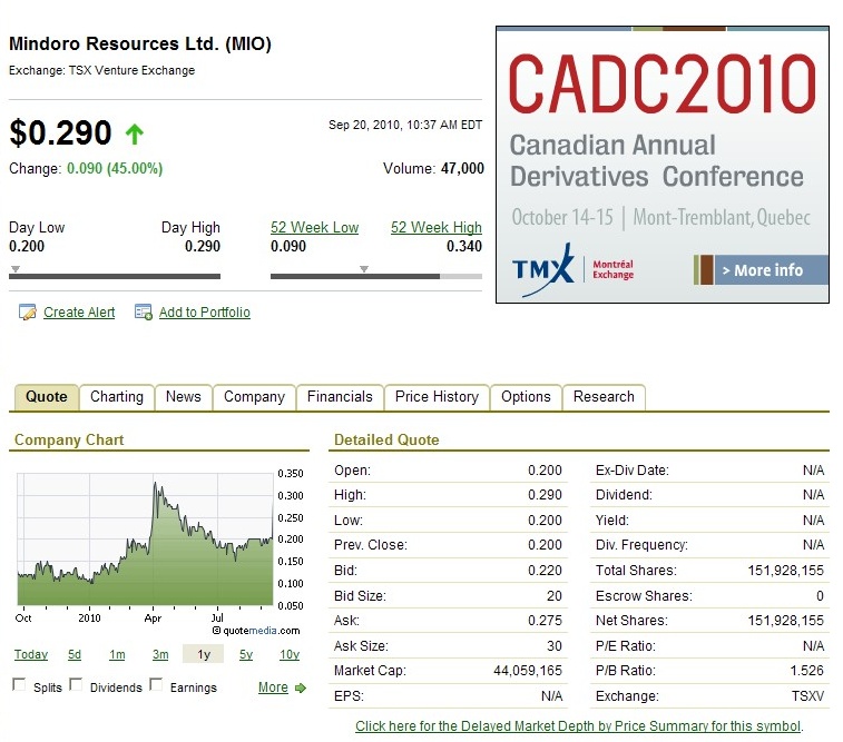 Mindoro ist in der jetzigen Phase kein Tradingwert. Die, die neu eingestiegen sind, sind bereit die Entwicklung des Werts von "unten" herauf zu begleiten. Ohne erneute News bröckelt der Kurs ein wenig. Zuletzt (01.10.) wurde der Kurs in Kanada mit 200 Shares um sagenhaft 1,5 Cents (Can$) "gedrückt". Das könnte auch ein "roter Teppich" für den nächsten Handelstag sein, eine Kursstellung des MMs, um nicht zu früh den Höhenflug zu suggerieren. Oder war es ein Verzweiflungsverkauf? Oft stehen an der TSX nicht mehr als 200 Shares im Bid. Dennoch schloss die TSX mit +2%.