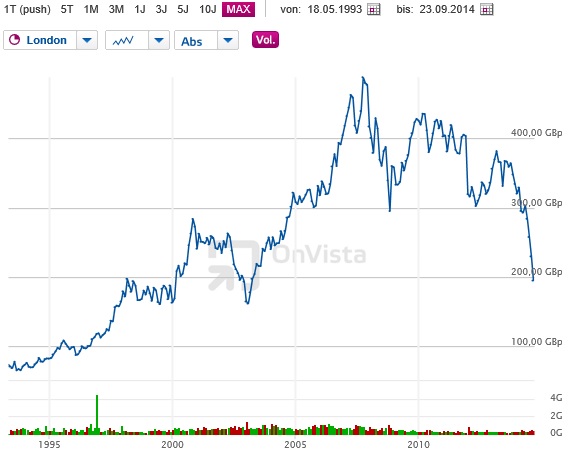 750 Mio. $ Verlust! Na und? Was ich ja nun wirklich im wahrsten Sinne des Wortes bemerkensw­ert finde: Warren Buffet macht mit seinem Invest in TESCO 750 Mio. $ Verlust, doch die Aktie seiner Holding Berkshire Hathaway geht am Tage dieser Bekanntmac­hung weiter ihren Weg nach oben. TESCO ist eben nur ein Rad im großen Getriebe, und wird in den nächsten Jahren noch hart an der Konkurrenz­, besonders von ALDI, zu knabbern haben. Ich sehe hier auf lange Sicht keine Erholung im Kurs, es wird meiner Meinung nach eine nach Süden gerichtete­ Seitwärtsb­ewegung geben, und das für sehr lange Zeit.