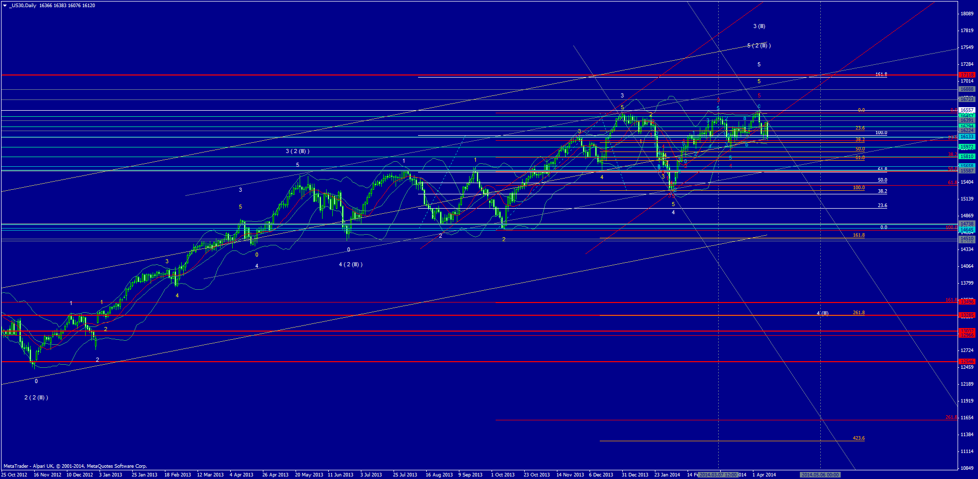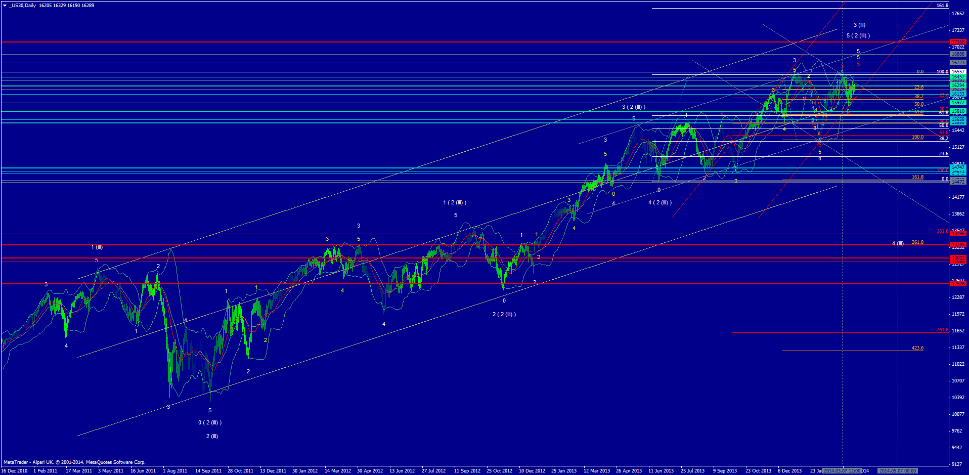 Korrekt ist, dass der DJIA seit dem 07/03/14 sinkt. Doch ebenso Fakt, das dortige Top liegt unter dem Top vom 31/12/13, somit ist der letzte Count zum Top 3(III) eigentlich noch nicht abgeschlossen (s. Count im Chart unten). Ähnliches gilt für den DAX.