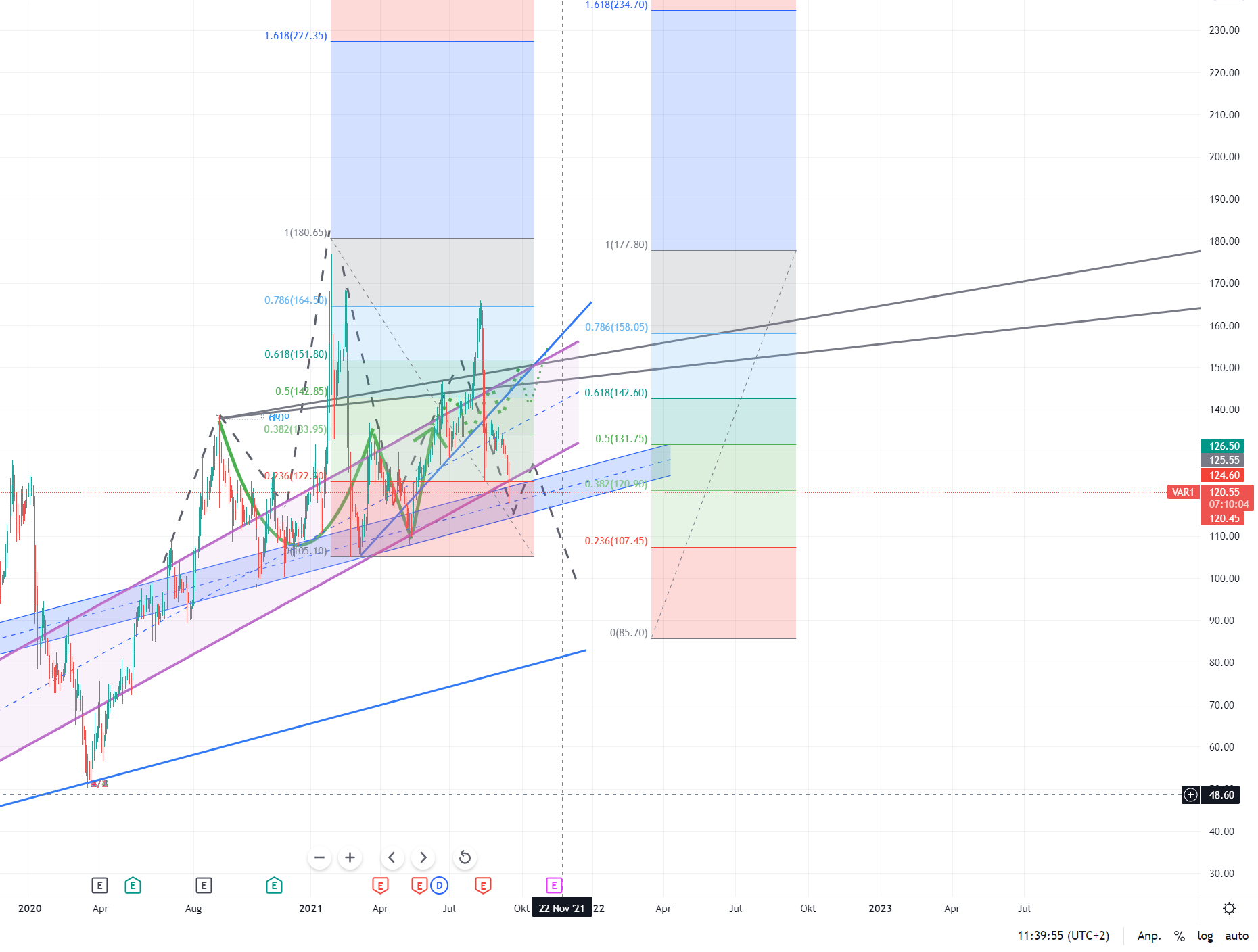 Die Marken sind unverändert. Dip bis 118, 115, 105 und nach oben 132 – 139 – 146.-€.