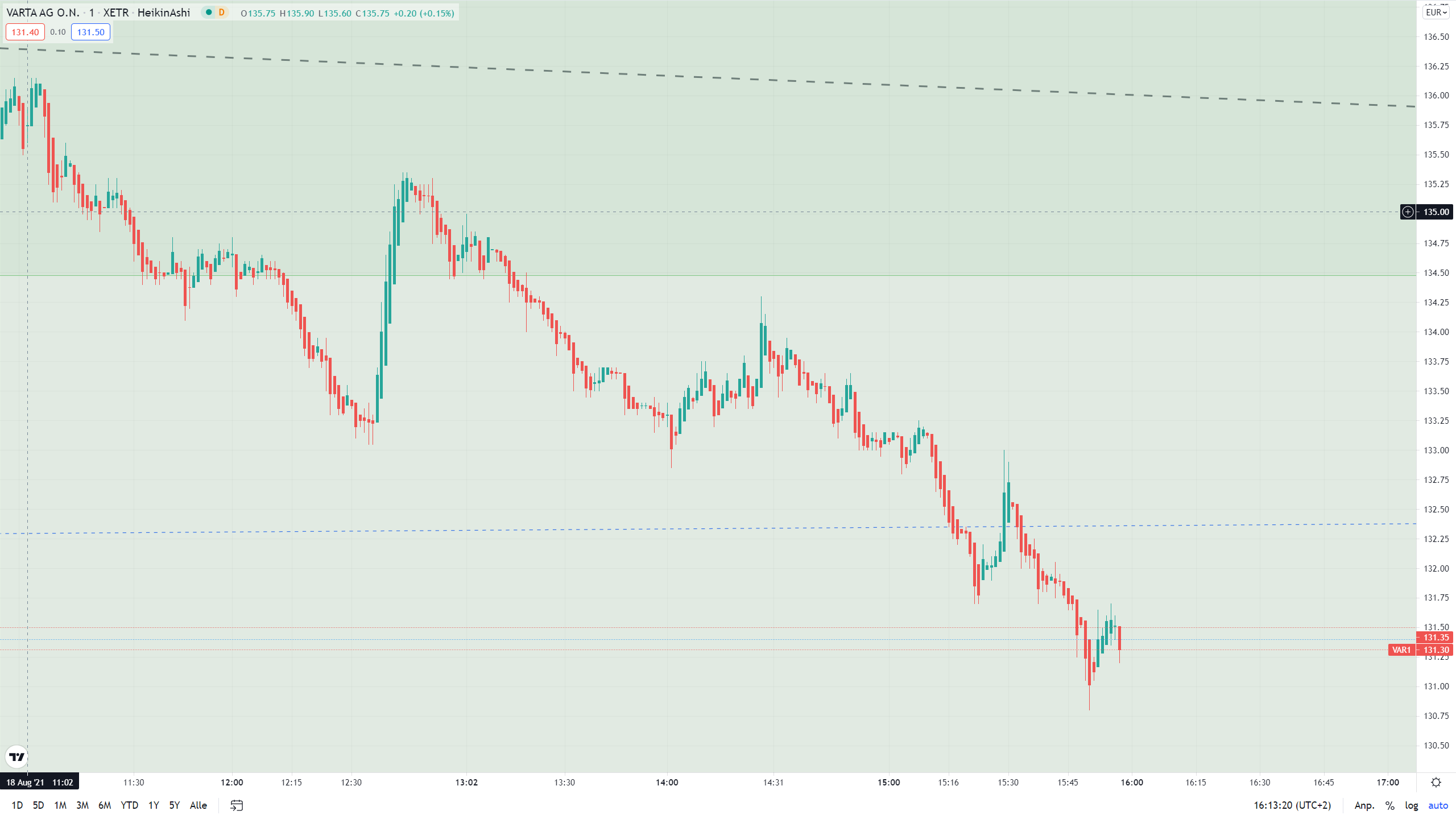 Richtig erkannt, der Wert liegt gerade auf 137,70€ hier wird versucht die grünen Kerzen zu kehren, um auf 134,45 – 134,90€ einen Anker für den nächsten Tripleschritt zu erzeugen.