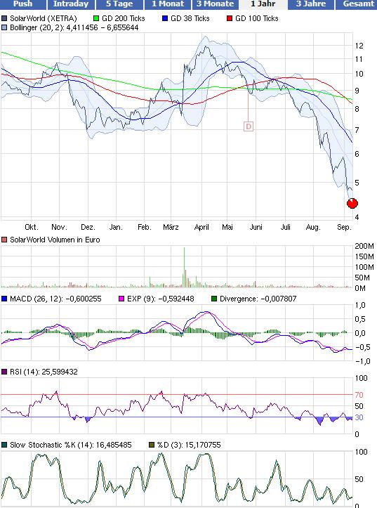 Schön, dass Du wieder da bist! Habe mich auch schon gefragt, was das mit "Sämper" soll ... Aber hier im Forum ist es wirklich so, dass Negativ-Stimmungsmache von Leuten betrieben wird, die schlicht keine Ahnung haben. Die Solarbranche ist nicht mit dotcom zu vergleichen, hier gibt es keine Blase, denn die Energiewende, die immerhin beschlossene Sache ist, wird erst noch so richtig ins Laufen kommen und die Photovoltaik wird dabei eine erhebliche Rolle spielen. Ich wiederhole mich nicht gern, aber noch mal die Fakten: 2010 ist sie kräftiger gewachsen als allgemein erwartet, hat die Wasserkraft von Platz 3 bei den Erneuerbaren Energien verdrängt, hat nun immerhin einen Anteil von 3,5 % an der Stromerzeugung im Land. Wir haben es in Q 3 mit einer Delle zu tun, das kommt in jedem Industriezweig vor, z.B. in der Autoindustrie, wo dann Autos auf Halde stehen. Aber hier die Pleitegeier schwirren zu lassen, ist übel und schädigt den Ruf solider Unternehmen wie SolarWorld. Und Wetten auf den Ruin hin gehören verboten. Was ist bloß aus der Börse geworden - schlimmer als Casino, denn hier wird Glücksspiel vermengt mit Realwirtschaft. Solches Glücksspiel gehört doppelt verboten - ist viel schlimmer als Poker im Hinterzimmer. Wer genau hingehört hat in den letzten Tagen, konnte positive Nachrichten hören, z.B. verstärkter Einstieg ins Recycling-Geschäft - die Grundstoffe sind zu kostbar, um sie auf den Müll zu werfen, sie werden auf dem Weltmarkt immer teurer werden, Asbeck denkt nicht daran, zu verkaufen, die Nachfrage hat bereits angezogen usw.usf. Heute ist Freitag, da werden die verunsicherten Angsthasen nicht kaufen, aber nächste Woche geht die Reise nach oben!