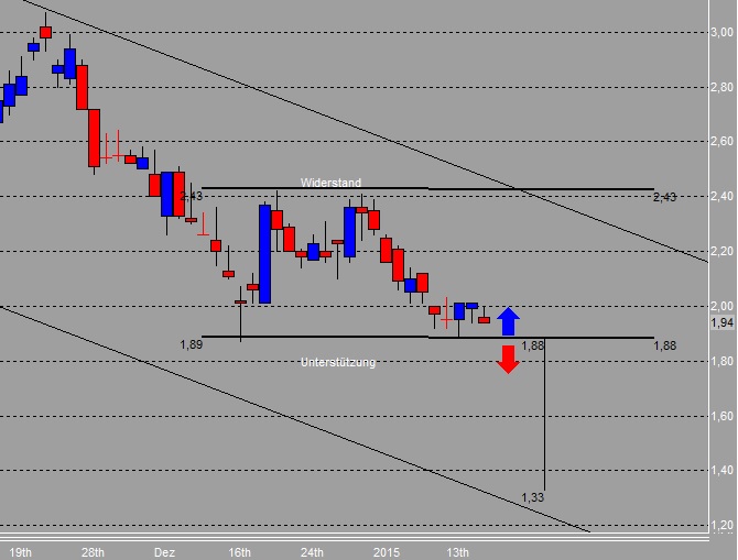 1. Wenn die nächste Tageskerze bullisch ist, dann long einsteigen mit einem StopLoss knapp unter der Untertützung bei 1,80. Kursziel wäre dann ca. 2,40.