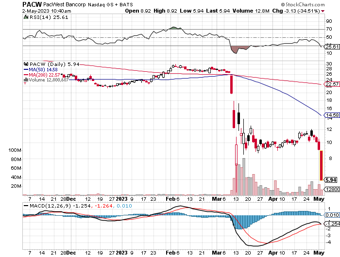 Betroffen sind vor allem die Banken Packwest bancorp (Chart unten) und Western Alliance. Es drohen weiterer erzwungene Übernahmen.