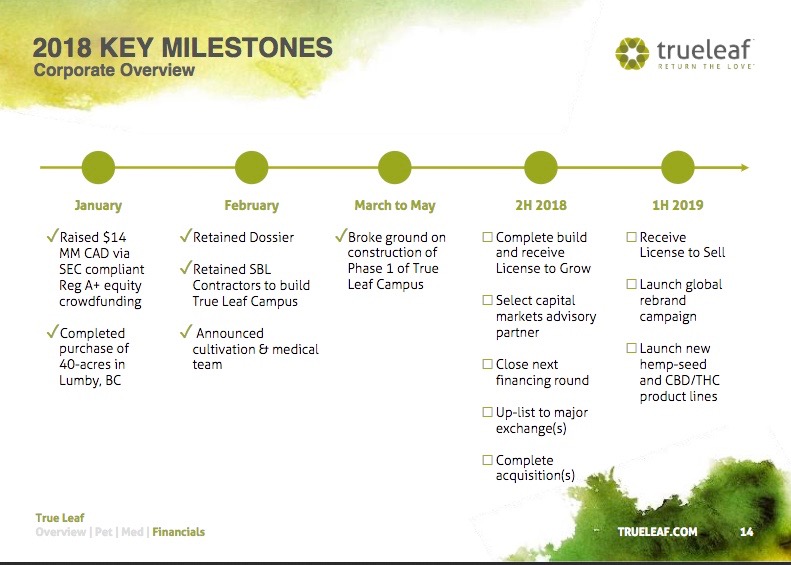Das Unternehmen hat bekannt gegeben, dass der Bau von True Leaf Campus, der Cannabisanbau und -produktion, planmäßig im Herbst 2018 abgeschlossen sein wird.