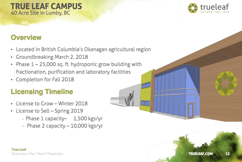 Der Bau des True Leaf Campus wird voraussichtlich im Herbst 2018 abgeschlossen sein. Der Besitz des 40 Hektar großen Geländes in Lumby bedeutet, dass das Unternehmen gut positioniert ist, um die zukünftigen Marktanforderungen zu erfüllen.