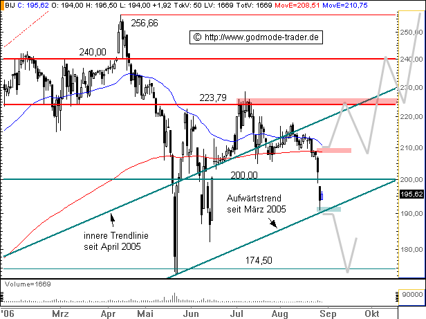 Rückblick: Die BIJOU BRIGITTE Aktie markierte nach einer langfristigen Rallye im April 2006 bei 256,66 Euro das AllTimeHigh und startete eine Abwärtskorrektur, welche zum Bruch des langfristigen Aufwärtstrends führte. Es folgte ein Kursrutsch bis an die Horizontalunterstützung bei 174,50 Euro, wo die Aktie wieder nach oben hin abprallte und bis an die Widerstandsmarke bei 223,79 Euro lief. Dort prallte sie zunächst nach unten hin ab, attackierte sie aber im Juli erneut. In dieser Woche scheitert ein weitere Ausbruchsversuch nach oben, die Aktie kippt wieder ab. Aktuell erreicht sie die Unterstützung der inneren Trendlinie.