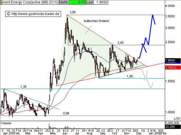 Diagnose: Die Torrent Energy Aktie pendelte nach der Erstnotiz im Juli 2004 volatil im Bereich um 1,00 $ seitwärts, bevor im April dieses Jahres eine gewaltige Rallye startete. Nach dem AllTimeHigh im Juni bei 3,56 $ folgte eine Korrekturbewegung, welche nach wie vor andauert und in den Konturen eines bullischen Dreiecks als Fortsetzungsformation im Aufwärtstrend läuft.