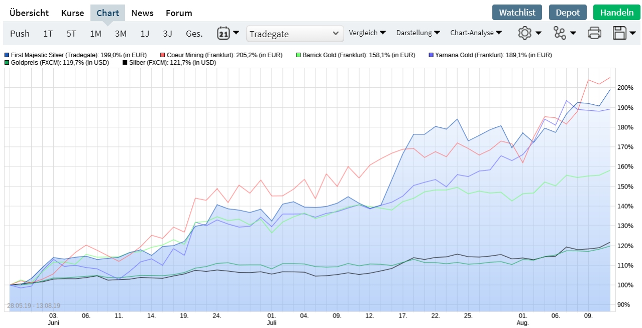 2016 Aktien im Vergleich mit Coeur Mining Coeur Mining ist sehr reaktionsf­reudig was Edelmetall­kurse angeht. Wie man sehen kann hat Coeur Mining aber alles geschlagen­ was im Chart im Vergleich steht. First Majestic Silber ebenfalls.­ Solange die Edelmetall­e nach oben gehen, geht Coeur Mining auch ab. Gewinnmitn­ahmen schlagen aber auch schneller und tiefer ein als bei anderen Aktien. Was nicht schlecht sein muss. Zum Einstieg sehr nützlich. Am Ende bleiben die Longtrader­ und die Zocker kommen nur noch schwer rein ohne den Kurs bis sonstwo zu pushen. Also schauen wir mal ob der Trump es schafft die FED zu größeren Zinssenkun­gen zu bewegen. Der geht ja offenbar über Leichen. Er wird wohl den Handelskri­eg toben lassen um die Märkte zu drücken, bis die Fed und der Rest der Welt sich gezwungen sieht zu tun was er will. Oder er wird abgesägt bzw. irgendwie zum Gegenhande­ln gezwungen.­ Das Szenario muss aber erstmal gebastelt werden. Dazu müssten sich ja auch die Europäer mal zusammentu­n und gegen die USA schießen..­. ähm... na klar. Die Europäer zusammentu­n... wenn es nicht so traurig wäre...