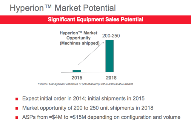...I am currently modeling Hyperion sales of $100m in 2015 and $800m in 2016 with a 45% gross margin. I expect Hyperion to contribute $0.18 in EPS in 2014 and $1.45 in 2016. I believe GTAT's Hyperion business ALONE is currently worth $24 per share,......