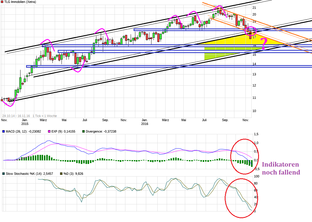 war natürlich Gift und verstärkt die Korrekturbewegung nochmal weiter. Die Indaktoren zeigen noch immer südwärts. Wobei der Stochi schon langsam in überverkaufte Regionen kommt. Immobilenwerte dürften generell in 2017ff als Branche underperformen wegen der sich ohnehin schon seit Wochen anbahnenden Zinswende, die natürlich mit der Trump-Wahl nochmal mehr Schub bekommen wird, wegen dessen Inflationstreibender Agenda. Daher fangen die großen instit. Anleger an auch Branchenrotation zu betreiben und wieder mehr auf Werte zu setzen die von steigenden Zinsen mehr profitieren. Viele kleine Anleger ohne makroökonomisches Verständnis meinen das wäre nur ein kleiner "Schnupfen" beim Kurs der schnell vorbei geht. Aber solche Zinsumkehrungen sind Pendelbewegungen die über Jahre gehen. Die letzten Jahre hatten die ImmoWerte ihre Party und jetzt kommt eben wieder mehr die Gruppe in Feierlaune die in den Letzten Jahren im Kalten vor der Party draußen im Regen warten mußten. Wäre jetzt nach dem Break der wichtigen Chartmarken gut möglich, daß man auch noch die Region um die 16 ( oder knapp darunter anläuft). Dort wären die nächsten Unterstützungen. Da könnte sich dann ein spekulativer Long-Trade anbieten, weil es etwas technische Gegenbewegung geben sollte.