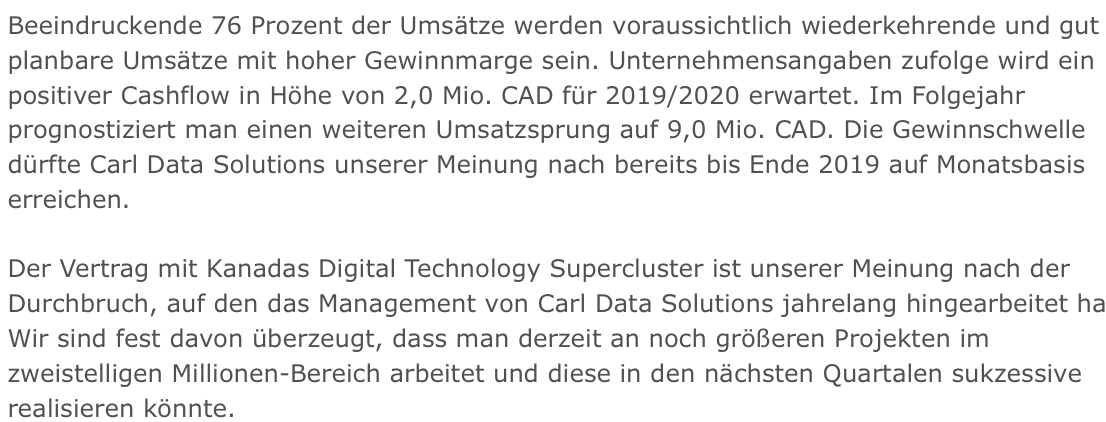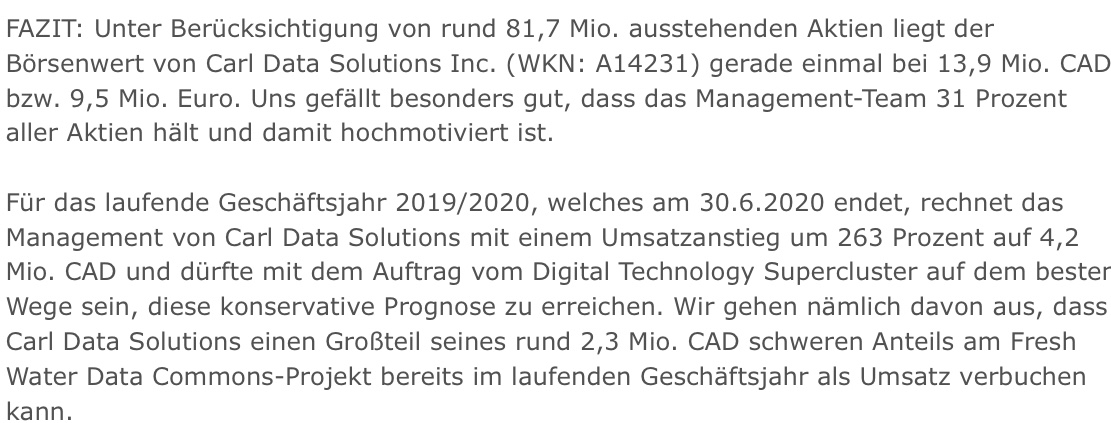 Heute möchten wir nur die Aktie von Carl Data Solutions analysieren, denn es gibt wichtige Neuigkeiten, die man unbedingt beachten muss. Deshalb ist auch unser Ratgeber-Aktien Musterdepot (Kontoauszug – oben klicken) so wichtig, wegen dieser Aktie. Bei Carl Data Solutions gibt es wichtige Neuigkeiten und Hintergründe, die den Aktienkurs in der kommenden Woche massiv beeinflussen werden. Als Anleger muss man jetzt unbedingt diese Fakten beachten, die wir Ihnen nun sehr gerne zeigen möchten: