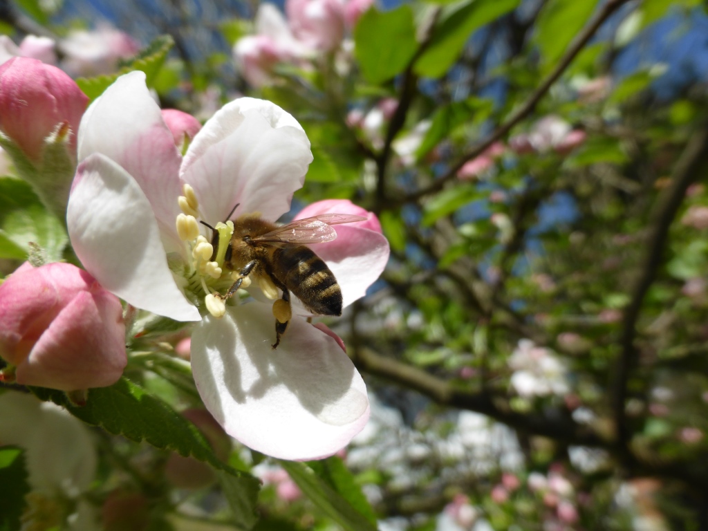 Nach vielen Jahren hat es der Büroapfelbaum mal geschafft, seine Blüten nicht vor dem Frost oder nur bei Regen zu präsentieren. Seit Tagen sind nunmehr Bienen in ihm unterwegs, um zumindest die Voraussetzungen für eine mögliche Apfelernte zu bilden. Erschreckend natürlich, ich habe nur fünf! gezählt.