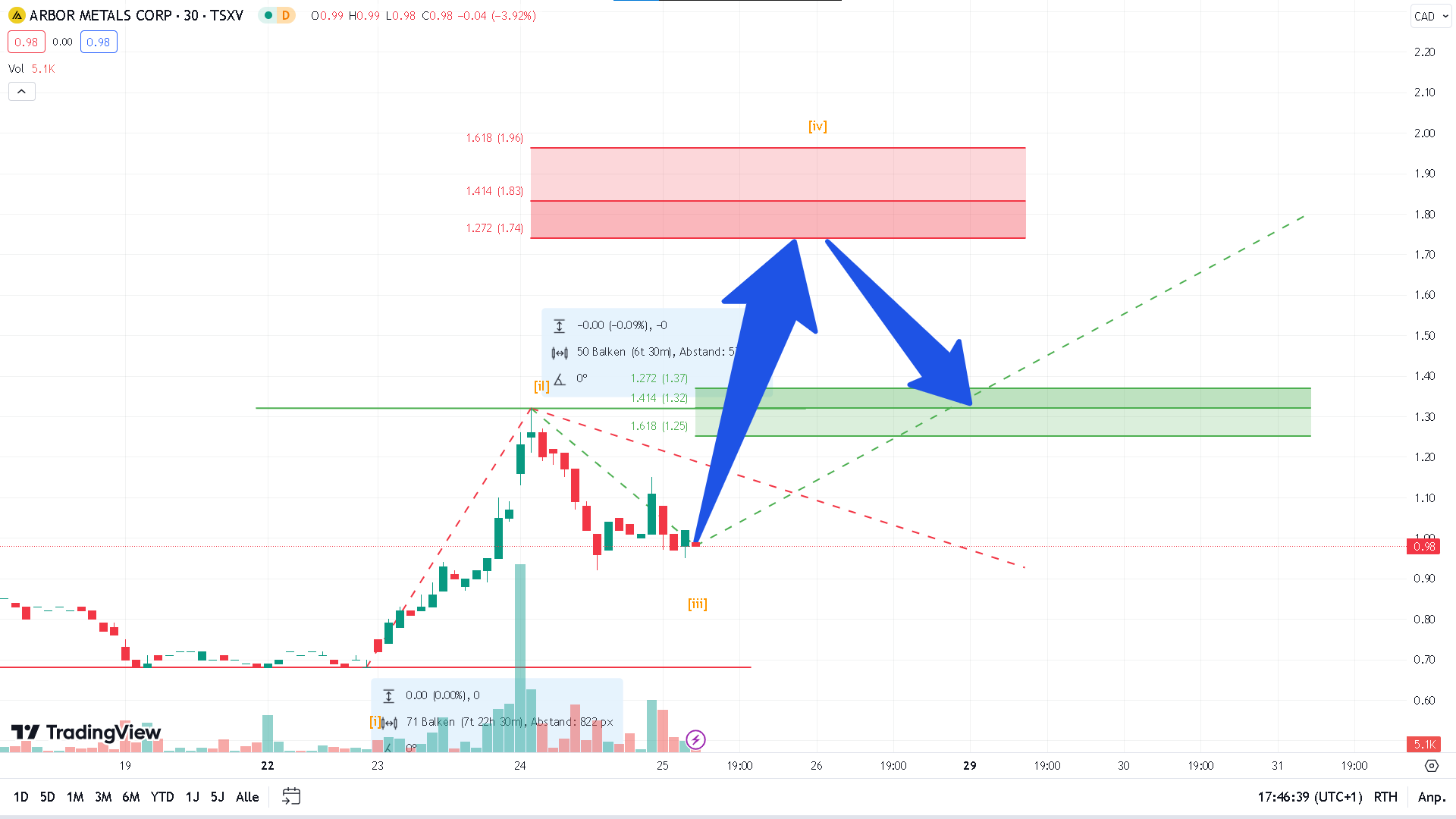 Dabei wäre für mich das All Time Low vor Bekanntgab­e der Ergebnisse­ der Anfangspun­kt für Welle 1, die dann bis 1,32CAD reicht (80%iger Anstieg). Von dort aus würde die Welle 2 Korrektur beginnen (wir hatten 30%) und wahrschein­lich schon bei 0,92CAD geendet haben.