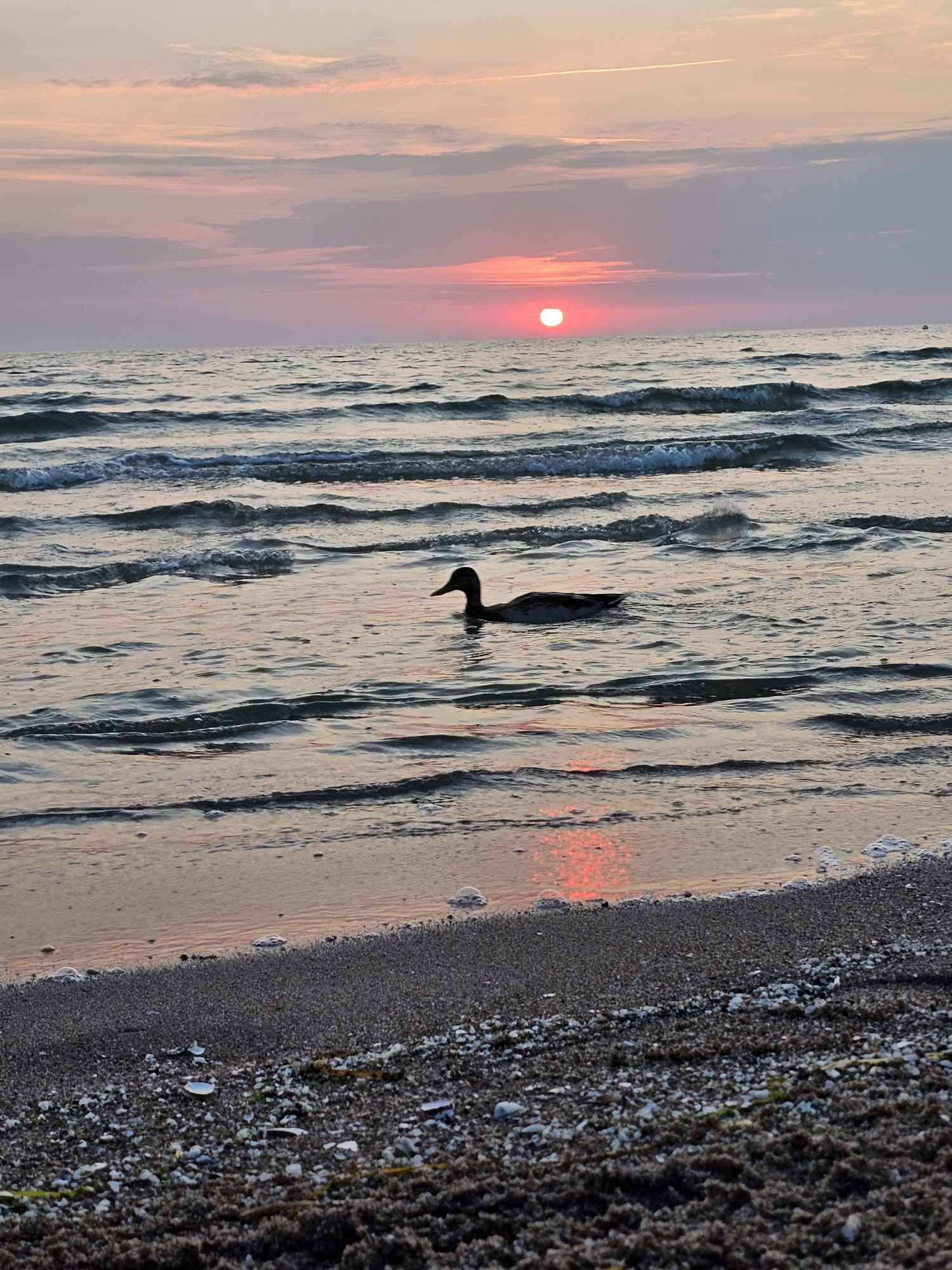 Heute Morgen dann zum Lockern der Gelenke der Sonnenaufgangsspaziergang am Strand. Der letzte heiße Spätsommertag mit 31 Grad wird höchstens noch einen Eisspaziergang mit sich bringen, mal sehen. Inzwischen bereits 22 Grad. Ab morgen dann Regen, den wir sicher auch wieder gebrauchen können. Ok, den Landwirten wird er zu früh kommen, hat hier oben doch die Maisernte begonnen.
