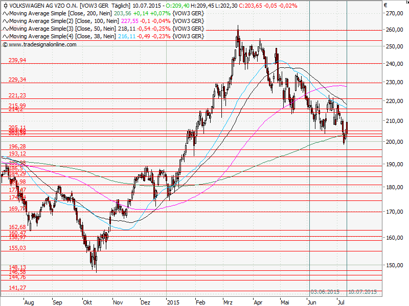 DAX heute mit +2,34% das macht es natürlich immer schwerer noch richtig gute Relative Charttechnik-Schnäppchen zu finden, a b e r heute habe ich doch noch mal G l ü c k gehabt, denn wie man am Chart gut erkennen hat ist Volkswagen geradezu ein s c h u l b u c h m ä ß i g e s Charttechnik-Schnäppchen und nach unten durch die m ä c h t i g e 200-Tage-Linie und starke Unterstützungen gut abgesichert und deshalb habe ich jetzt den Rendite-pro-Zeit-Trade auf VW gestartet durch den Kauf der Aktien !!!