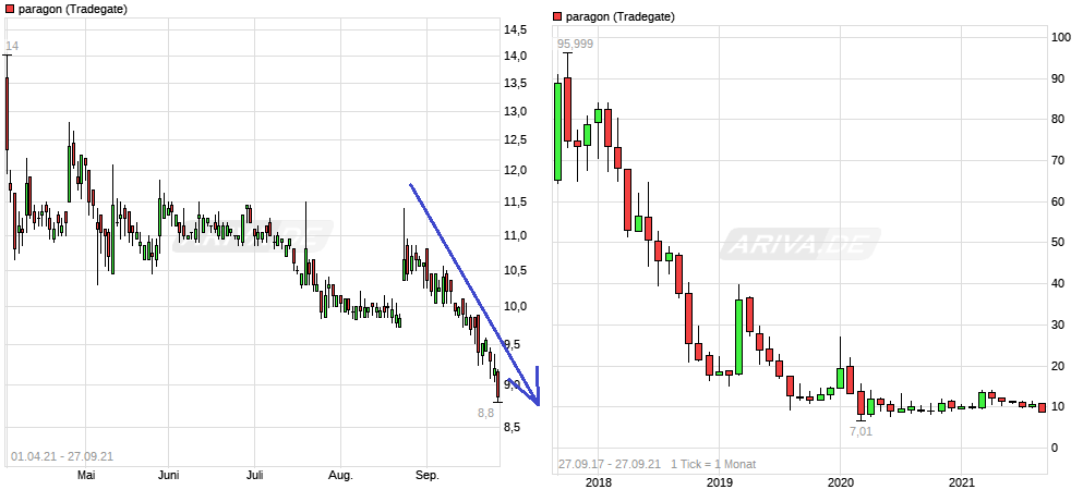 ".....paragon meldet Zahlen für die ersten neun Monate 2021...Unter dem Strich schreibt die Gesellschaft mit 14 Millionen Euro Verlust weiter rote Zahlen....Liquide Mittel werden mit knapp 2 Millionen Euro ausgewiesen.... Ohnehin wird die Liquiditätssituation der Gesellschaft noch interessant. .... Anfang Juli 2022 eine Anleihe mit einem Emissionsvolumen von 50 Millionen Euro tilgen muss. Wie das geschehen wird, bleibt offen und die Gesellschaft nennt hierzu keine Details. ......Noch im Geschäftsbericht 2020 hatte paragon auf ein bestandsgefährdendes Risiko aus den Tilgungen der Anleihen 2022 hingewiesen - neben der Euro-Anleihe müssen im April bereits 8,25 Millionen Schweizer Franken als Teiltilgung für die CHF-Anleihe der Gesellschaft aufgebracht werden, 2023 sind hierfür laut Geschäftsbericht weitere 21 Millionen Schweizer Franken aufzubringen...."