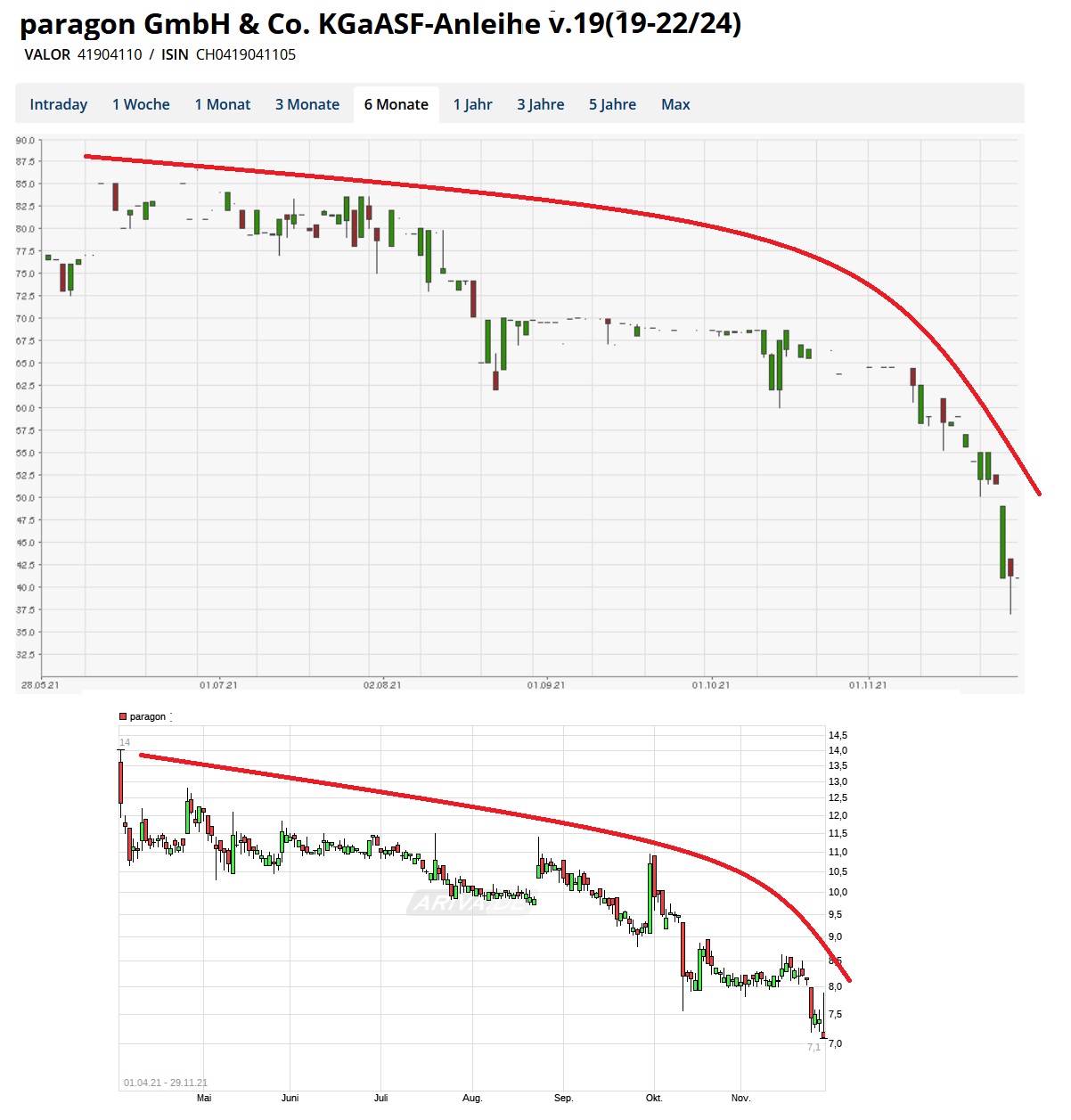 Die Paragon-Anleihen machen ja schon seit Monaten den Eindruck, daß man eine immer größere Insolvenzgefahr sieht bei der Frers-Hütte Die Franken-Anleihe notiert aktuell nurnoch bei einem Wert um 40 , d.h. hat sich in den letzten Monaten halbiert . Frers hatte damals riesige Summen an neuen Schulden durch mehrfache Anleihe-Ausgaben gemacht, weil er da noch mit dem damaligen höheren Wert der Voltabox-Tochter wuchern konnte bzw. die Anleihezeichner diese Tochter damals noch naiverweise als Sicherheit ansahen. Das rächt sich jetzt. Nachdem der Voltabox-Kurs bekanntlich ebenfalls eine Crash erlebte und Paragon jüngst vermutlich nurnoch wenige Mio. € für die knapp 50% an Voltabox bekommen hat, dürften die kommenden Monate heikel werden. Denn wenn man keine hinreichende Refinanzierung hinbekommen sollte und Gläubiger dann auch nicht freiwillig schon einem Teilverzicht bei der Tilgung zustimmen würden, dann wäre hier im Sommer 2022 wohl Insolvenz die Folge. Nur wer gibt der substanzarmen Paragon derartig hohe Gelder für eine Refinanzierung, wenn der ganze runtergewirtschaftete Laden selber inzwischen nichtmals mehr einen Wert hat der die benötigen Mittel übersteigt?