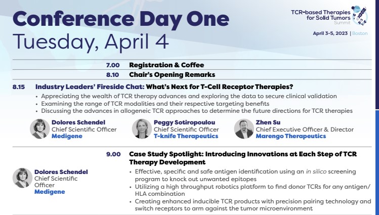 Die Medigene AG (Medigene, FWB: MDG1, Prime Standard), ein Immunonkologie-Unternehmen, das sich auf die Erforschung und Entwicklung von T-Zell-Immuntherapien für solide Tumore konzentriert, wird auf dem 4. TCR-based Therapies for Solid Tumors Summit präsentieren, der vom 3. bis 5. April 2023 in Boston stattfinden wird.