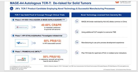 As announced in October 2022, the initial focus of the collaboration was 2seventy bio’s potency enhanced MAGE-A4 TCR program in solid tumors which is being developed as part of a collaboration with Regeneron. Over the last 10 months, JW Therapeutics has successfully progressed this candidate and is on track to initiate an investigator-initiated study in China by the end of 2023 and well ahead of the original timeline. In addition to the pace of development, the significantly better cost structure of preclinical and early clinic development performed through JW Therapeutics’ internal and external development network provides additional rationale for further collaboration. To this end, the intent of the expanded collaboration is to add two new programs: an additional solid tumor program and 2seventy’s first autoimmune disease (AID) targeted CAR T cell program.