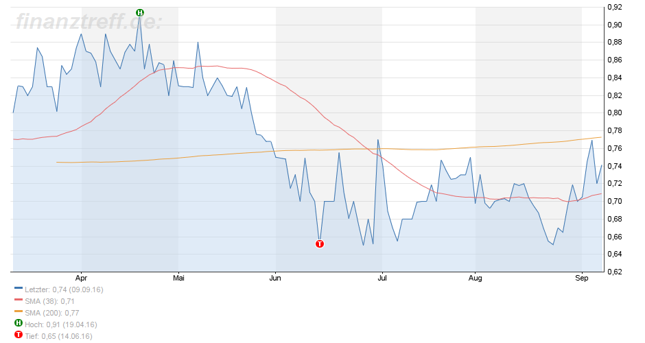Okay jetzt steht sie gerade beim Tief Juni 2016.Das Hoch davor auf XETRA bei 0,91.Nächster Termin ist der Halbjahresfinanzbericht 2016 Ende September.2 der Altpositionen wurden laut Nachrichten in Juli und August verkauft.Hier interessieren sich nicht sehr viele für die Aktie.Aber was heisst das schon.