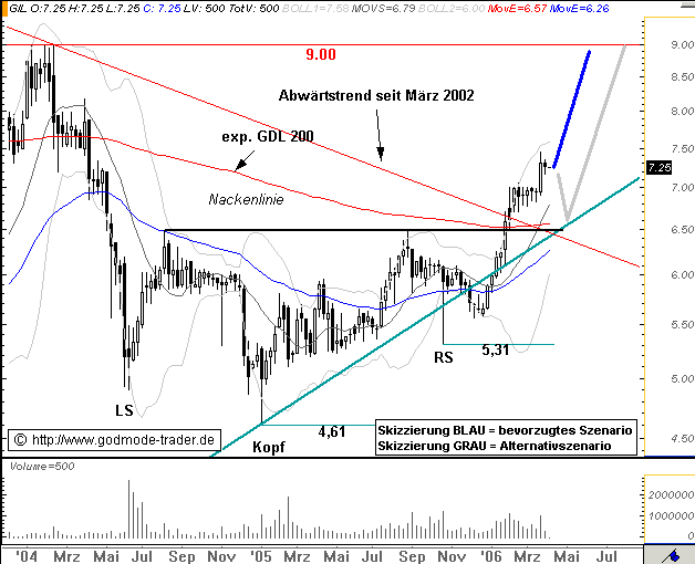 Rückblick: Die GILDMEISTER Aktie korrigierte nach dem Hoch aus dem Februar 2004 ausführlich. Ab Juli 2004 bildete die Aktie innerhalb dieser Korrektur eine Bodenformation in Form einer inversen SKS aus. Ende Januar durchbrach die Aktie die Nackenlinie der SKS und generierte damit ein mittelfristiges Kaufsignal. Nach dem Ausbruch lief die Aktie zunächst einige Wochen seitwärts. In der vorletzten Woche zog die Aktie aber deutlicher an und beendete die kleine Seitwärtsbewegung.