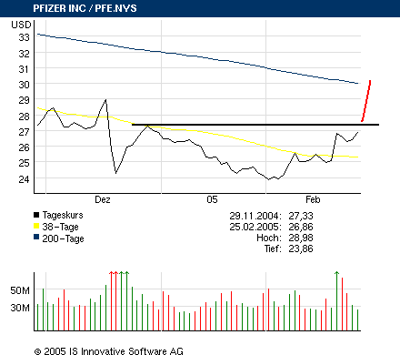 Psychologisch drückte auch der Fall des Erz-Konkurrenten Merck. Merck war ja ebenfalls wegen eines Cox-2-Hemmers (Vioxx) so stark gefallen. Aber das ist nun wie gesagt Vergangenheit. Auch wenn charttechnisch erst bei einem Bruch von 29 Dollar "das Kaufsignal" kommen mag, fühle ich mich ganz wohl dabei, bereits deutlich tiefer eingestiegen zu sein - mag es auch aus charttechnischen Erwägungen noch so dumm gewesen sein.