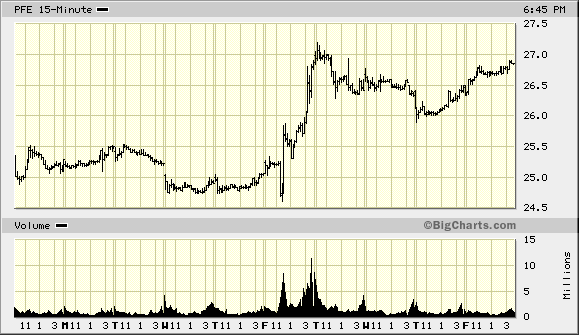 Der 10-Tages-Chart von PFE, den ich spaßeshalber mal unten anhänge, sieht übrigens recht ordentlich aus (Cup and Handle). Was davor war, ist Vergangenheit, die durch das COX-2-Votum des FDA-Panels nun auf den Friedhof der Geschichte gehört. Oder hast Du schon mal erlebt, dass die Börse sich für ihre gestrigen Fehleinschätzungen interessiert hat?