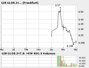 A0HHA8 Global Intelligence Board Inc.Reg. Shares Reg S (new) DL 10 XETRA 0,35 EUR +70,73% 14:07 19.04.06 - -- - 0,35 0,35 0,205 0,35 3,50 10