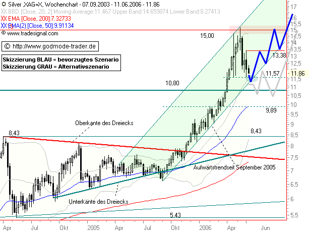 Rückblick: Nach 19monatiger Seitwärtsbewegung in einem bullischen Dreieck generierte SILBER mit dem Ausbruch aus selbigem ein mittelfristiges Kaufsignal. Es folgte eine steile Kursrallye, welche das Edelmetall auf den höchsten Stand seit über 20 Jahren brachte. Am Rallyehoch bei 15,17 $ am mittelfristigen Widerstandsbereich bei 14,80 - 15,30 $ startete dann Mitte Mai eine Abwärtskorrektur bis an den Unterstützungsbereich bei 11,57 - 11,80 $, wo SILBER aktuell eine Stabilisierung versucht.