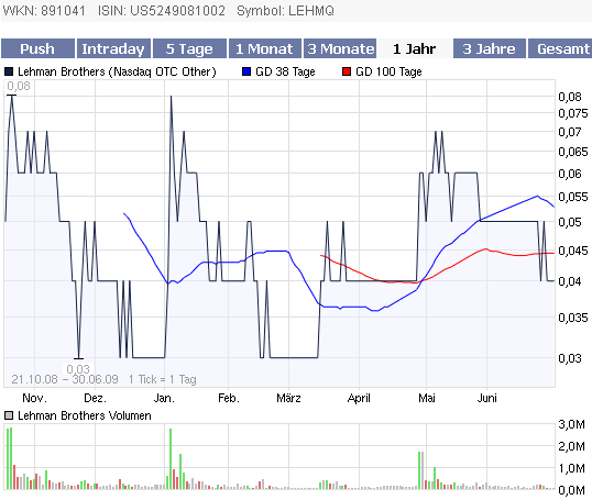 Einfache Aufgabe eigentlich: WKN 891041 eingeben, Börse NASDAQ OTO (=Over-the-Counter: Other) auswählen, und dann den Curs-Verlauf als vom DONNERSTAG (25. September 2008) bis zum heutigen DIENSTAG (30. Juni 2009) fortgeschriebene GRAPHIK in den hiesigen Discussions-Faden bringen...