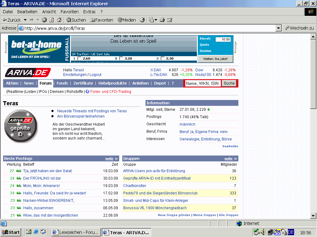 Man findet Dich derzeit selbst dann nicht, wenn man per "Copy Paste" den Link auf Dich http://www.ariva.de/profil/etk%FCttwieetk%FCtt in die Address-Zeile entert. - Hier auf diesem Wege meine Einladung an Dich: