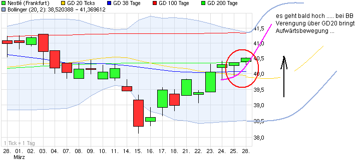 Also ich geh davon aus, dass nach überschreiten des GD 20 (gelbe Linie) der GD 38 (blaue Linie) noch geknackt wird und sich daraus ein Aufwärtrend bis zum 100er Durchschnitt (rote Linie) entwickelt. Damit wäre der Widerstand des Wimpels geknackt und der Kurs könnte bis 25. März bei €40,55 an GD 20 konsolidieren.... als Unterstützung fungieren dann GD 20 und untere Wimpellinie .... pfalls das so kümmt erwarte ich Ende März die Vollendung einer W-Formation deren Fähnchen im April für weiteren Auftrieb sorgen....