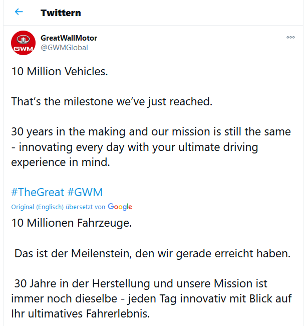 Sales report Great Wall 2020 über 1,12Mil. Fzg. 4,8% mehr als letztes Jahr!