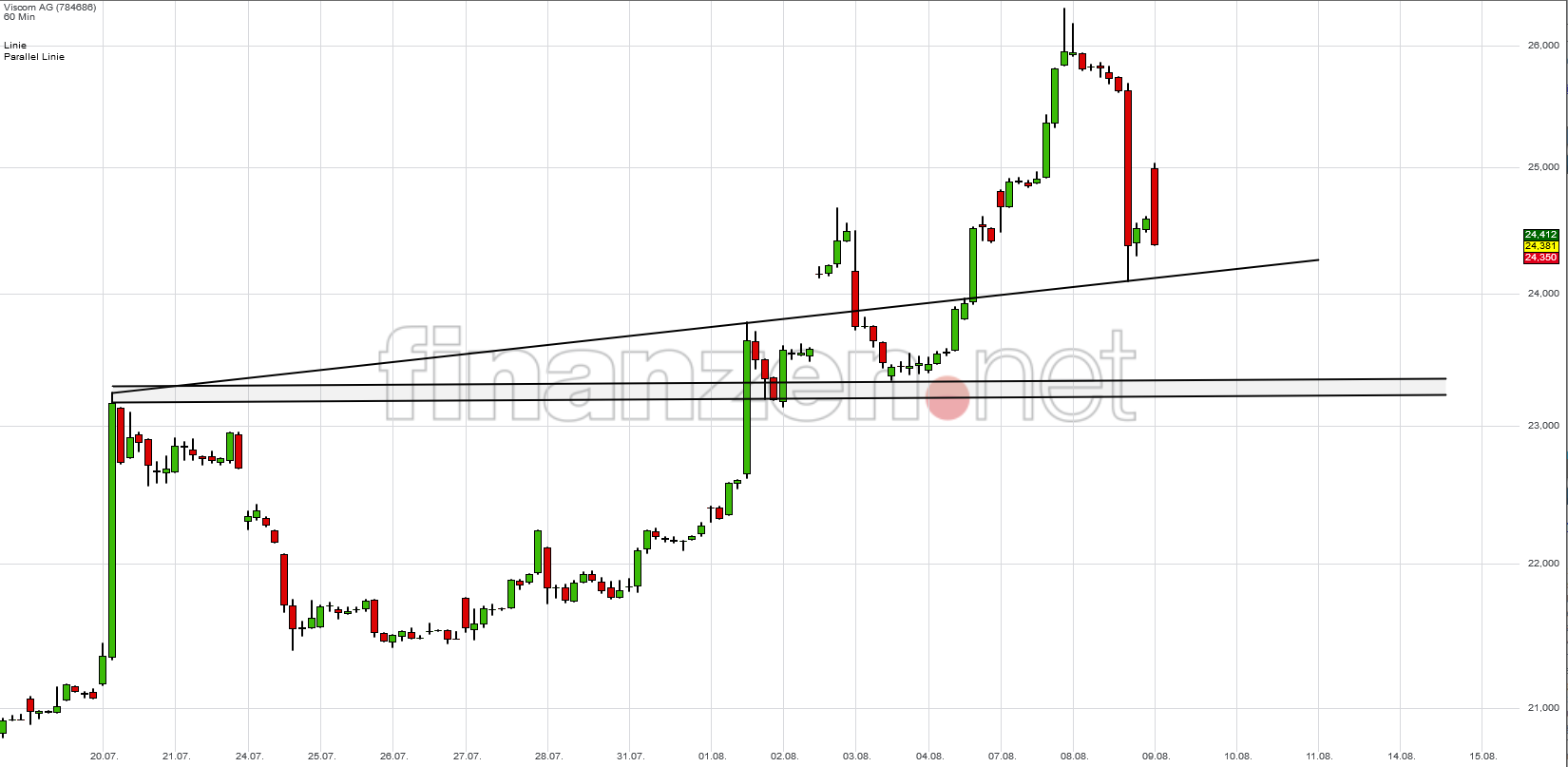 war es eigentlich zu erwarten, dass es einen Rücksetzer geben wird und ich vermute, dass der steile Trendkanal in den nächsten paar Stunden/Tagen aufgegeben wird. Technisch gesehen sind wir in einen Kreuzwiderstand gelaufen, hatte mich daher auch bei 25,55 abgesichert und bin raus geflogen. Von der Untergrenze des breiteren Trendkanals sind wir weit entfernt.