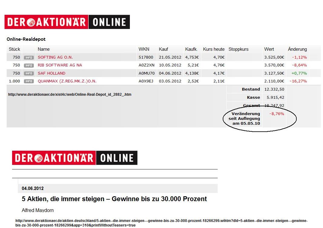 Noch so "Experten-Team" ist ja die Truppe von "der Aktionär" . Wenn man sich mal die lausige Performance des Musterdepots anschaut und dann liest was sie dieser Tage wieder an Propaganda raushauen (immer sicher Gewinne, xxxx% blablabla), dann fragt man sich warum die dann selber so grottige Perfomance machen und nicht glänzen im Depot mit den Aktien die nur steigen können und nie fallen ;).
