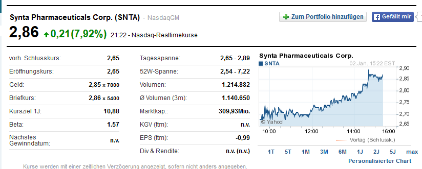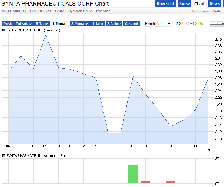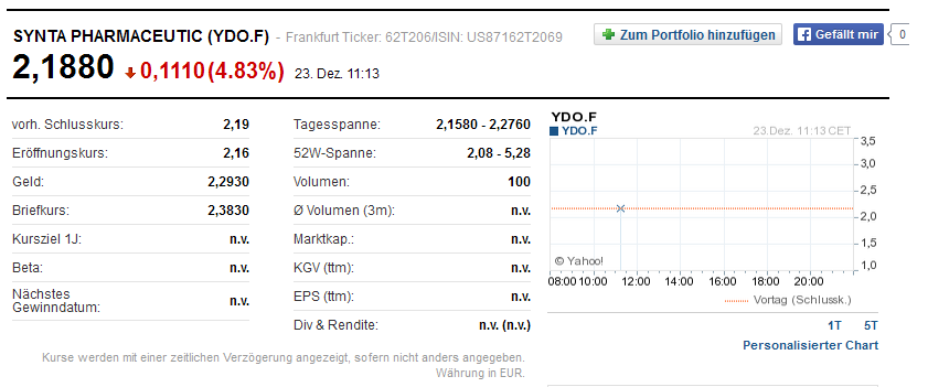 wird Synta an deutschen Börsenplätzen selten gehandelt und es gibt bei Yahoo finance deshalb alte Kurse.