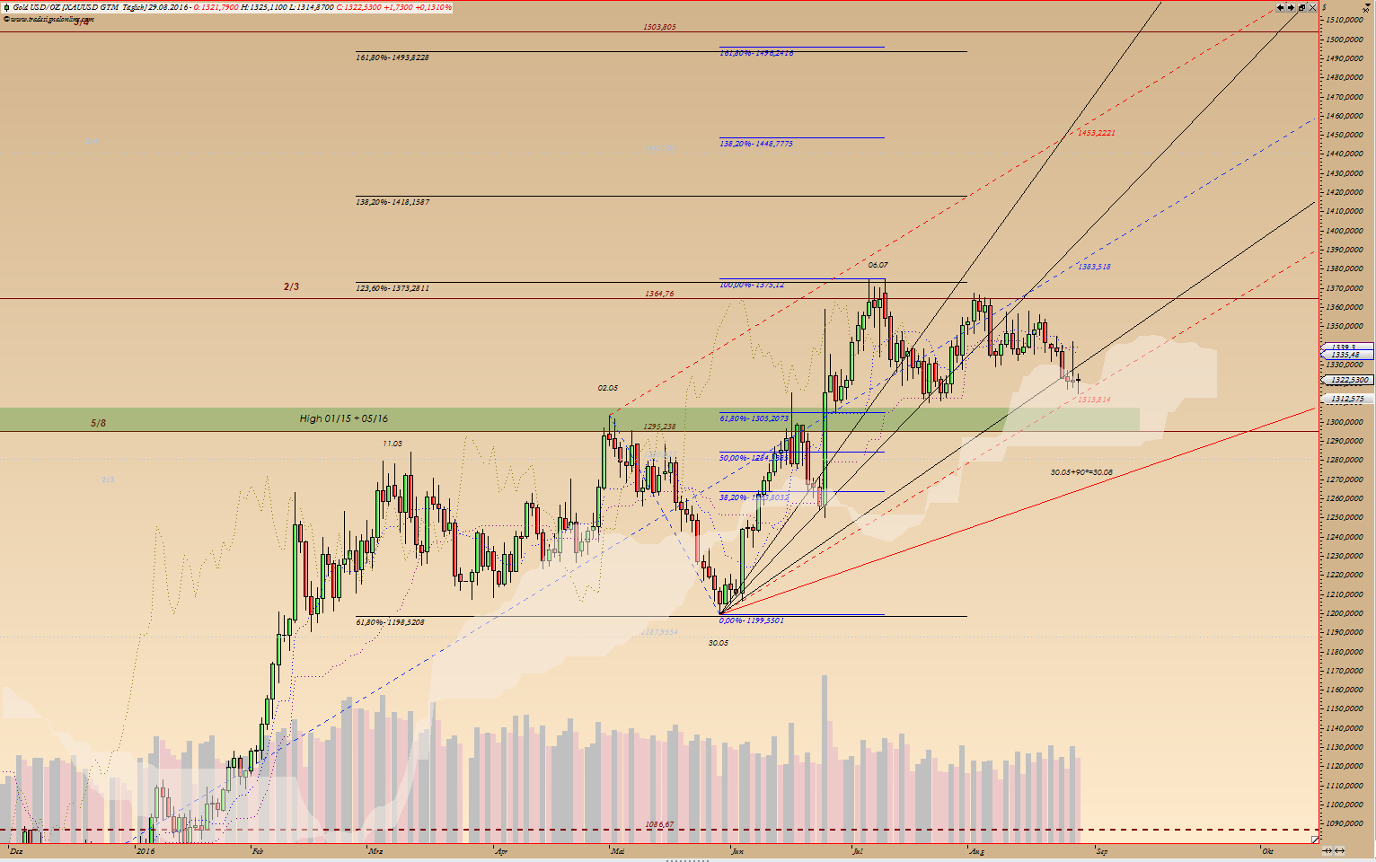 Kurzfristig – seit Mai 2016 aufwärts und seit 06.07 – Konsolidierung. Ein Trend neigt dazu sich fortzusetzen als umzukehren. Hoch am 06.07 erfolgte an der 2/3 Gann Linie und ging bis Unterstützung bei ca. 1300.