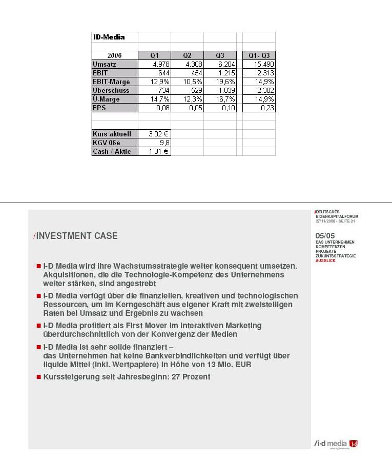 Nach neun Monaten im laufenden Geschäftsjahr habe I-D Media das EBIT auf 2,3 Mio. Euro gesteigert, was bereits einer Steigerung gegenüber dem gesamten Vorjahr von 27% entspreche. Der Nettogewinn habe ebenfalls bei 2,3 Mio. Euro gelegen, was auf hohe Verlustvorträge von 42 Mio. Euro zurückzuführen sei.