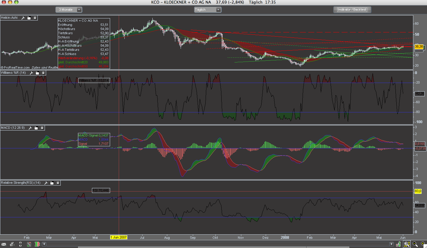 Ich denke, das Klöckner indestes 30 % unter Wert ist im Moment. Fundamental sowie Charttechnisch sieht Klöckner sehr gut aus. Mein Ziel in denn nächsten 4 Wochen sind 45 Euro. Hier auchnochmal der Chart in dem man sieht wie sich die Indikationen bewegen. Strong buy...