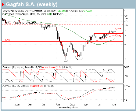 Auf dem Weg zum Ausschöpfen dieses Kurspotenzials stelle das jüngste Verlaufshoch bei 8,05 Euro zusammen mit dem Tief vom Juli 2008 bei 8,06 Euro eine wichtige Zwischenbarriere dar. Gelinge der Sprung über diese Hürde, würden aus charttechnischer Sicht die nächsten Widerstände erst wieder in Form verschiedener Hoch- und Tiefpunkte bei gut 10 Euro warten. Da die Indikatoren derzeit nur noch ein gemischtes Bild zeichnen würden – der MACD sei beispielsweise im Tagesbereich "short" positioniert, während der Trendfolger bei wöchentlicher Berechnungsweise noch freundlich zu interpretieren wäre –, sollten Anleger dem Stop-Management ein besonderes Augenmerk widmen.