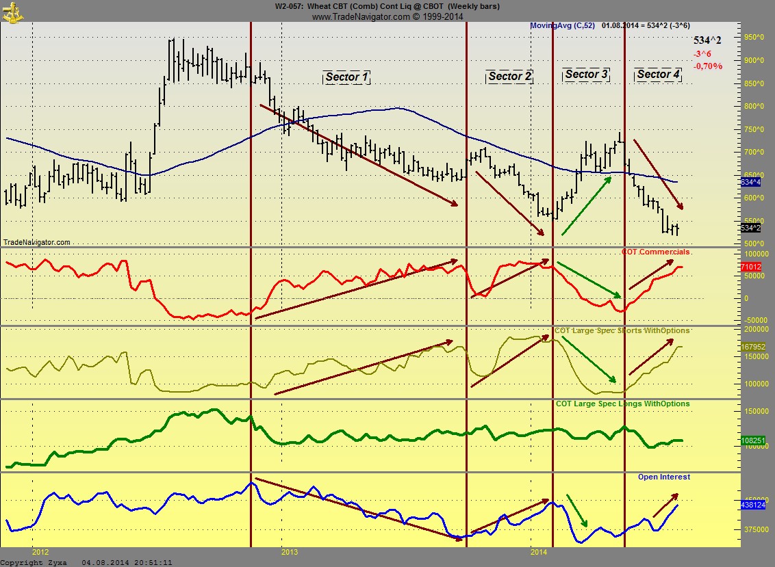 Das OI kann viel über einen Markt aussagen....in Sector 1 sieht man wie das OI mit dem Preis sinkt, das ist wohl so zu interpretieren, das laufend Kontrakte geschlossen werden und lediglich die Large ihre Short Posis aufstocken die von den Commercials gehalten werden.