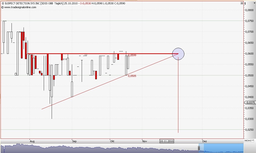 Charttechnisch bildet sich ein bullisches Dreieck heraus, wahrscheinlich von den Market Makern mühsam in den Kurs eingepflegt. Auch wenn man die Charttechnik nicht zu seinen Entscheidungsfindern der eigenen Investitionsstrategie zählt, dürfte man diese Formation schon oft genug gesehen haben. Es zeigt die obere stärkere Linie als starken Widerstand der in einer Linie die obere Kursabgrenzung darstellt. Die von links unten nach rechts oben laufende schwächere Linie zeigt den Trend den De Roje gemeint haben dürfte. Beide Linien treffen sich an einem fiktiven Punkt weit vor den letzten aktuellen Kursen. In der Charttechnik geht man nun davon aus, dass es auf dem Weg von den letzten Kursen bis in die Spitze des Dreieckes hinein zu einem Ausbruch kommen wird. Da es sich hier um ein bullissches Dreieck handelt wird der Ausbruch nach oben erwartet, mit signifikanten Kurszuwächsen, hier ca 0,035$ vom heutigen Kurs nach oben. Auffällig ist die von der Spitze des Dreiecks aus nach unten gelotete Linie, sie trifft in etwa mitte November auf den Bereich in dem die Q3/10 Zahlen kommen sollten. Wenn die Charttechnik die in sie gesetzten Erwartungen erfüllen soll, dann muß es bis dorthin zu höheren Kursen kommen. Meiner Meinung nach ist das ein Wink mit dem charttechnischen Zaunpfahl, ein Signal der MM's an die Anleger, denn bei den geringen gehandelten Volumen wäre es ein sehr unwahrscheinlicher Zufall, dass sich ein solcher Kursverlauf aus den getätigten Orders ergeben hätte.