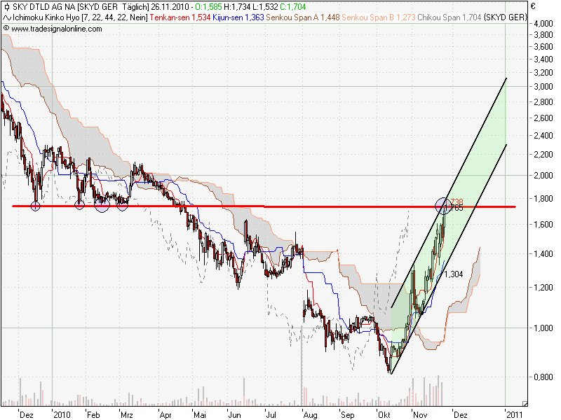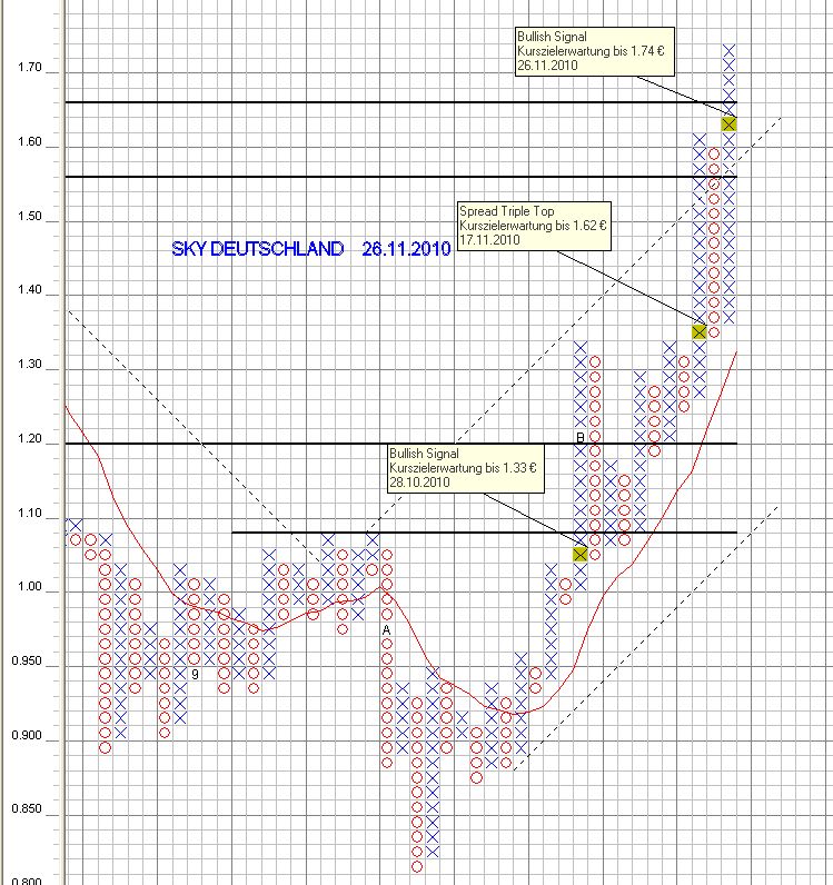 Frühere Analystenkommentare im November z. B. von der UBS stufen SKY Deutschland als neutral ein und halten am Kursziel von 1,43 € fest (Analyse vom 23.11.2010). Bankhaus Lampe wiederum gab eine Verkaufsempfehlung und stuft den Kurs bei 0,80 € ein (Empfehlung vom 12.11.2010). Ins gleiche Horn stieß die Norddeutsche Landesbank, allerdings mit Kurseinschätzung von 1,00 €. Persönliche Anmerkung - Für die Verkaufsempfehlungen der vorgenannten Bankhäuser gab es zu diesem Zeitpunkt charttechnisch keinen Anlass.