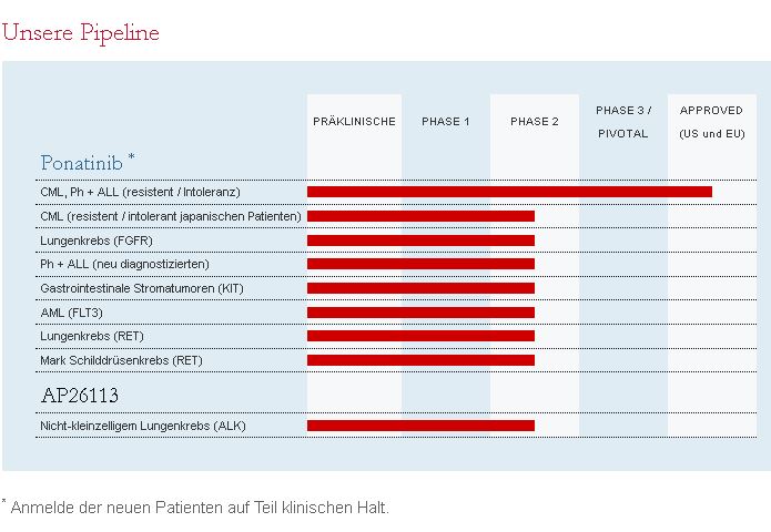 Die pipe ist sehr beeindrucken.Ariad zählt von der Unternehmens größe jetzt nicht zu den Big Player aber die haben halt trozdem einen Ordenliche pipe.Und da Sie jetzt mit einem Medika endlich Geld wieder verdienen können und damit ein Problem weniger haben,kann man sich jetzt auch wieder auf die anderen studien stürzen ;-) Ariad ist für mich in den letzten Wochen wieder in einen solieden wert gerutsch mit derzeit genügen Cash für weitere Studien ETC und einem Medika was sehr bedeuten für Leugemie Kranke Menschen ist.Was ja auch die FDA eingesehen hat in Ihren Klausuren