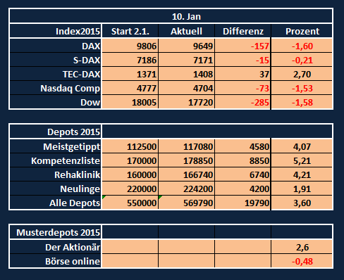 Ich denke, dass wegen der vielen Krise die Aktienmärkte sich am 31.12.2015 auf einem tieferem Stand befinden als jetzt. Daher ist es auch meiner sicht noch schwerer positiv entwickelnde Aktien zu finden. Habe daher nur 2 Aktien im Depot.