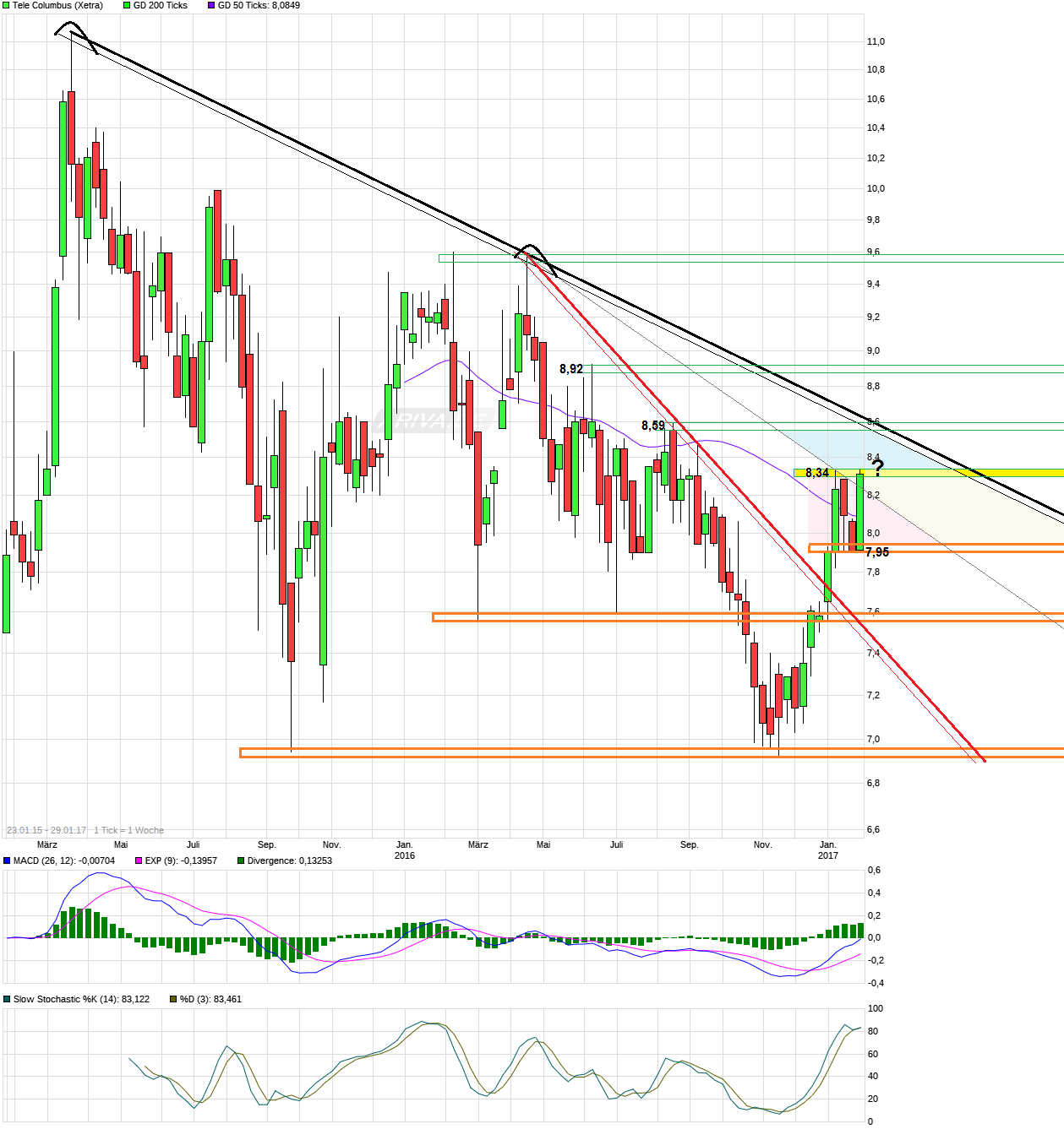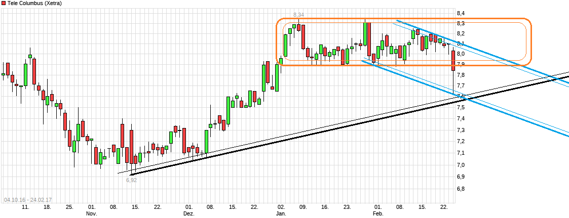 erstmal schön. Noch schöner wäre es jetzt auch noch die 8,34 rauszunehmen in der kommenden Zeit, um sich damit weiter dem längerfristigen Abwärtstrend wieder zu nähern. Der ( oder die) Altaktionär(e), die im Okt./Nov.2016 so kursunschonend abgeladen haben sind längt fertig und momentan ist auch nicht erkennbar, daß weitere größere Aktionäre wieder abladen. Wenn also die größeren Aktionäre weiter die Füße jetzt stillhalten, der Gesamtmarkt weiter freundlich bleibt und Tele Columbus bei den Zahlen zu gefallen weiß, dann könnte der Anstieg bzw. der Rebound nach den heftigen Knick im letzten Herbst noch etwas weiterlaufen. Negatives Zeichen wäre es, wenn man auf SK unter 7,95 zurücklaufen würde.